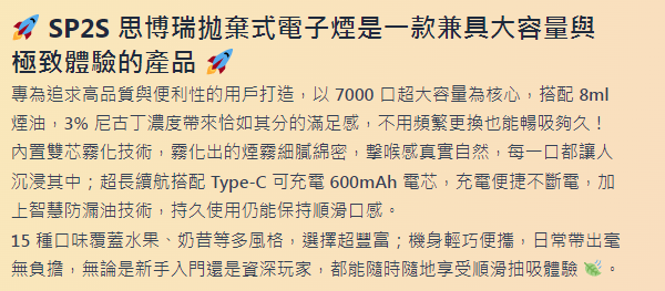 品牌:SP2S 思博瑞一次性 / 拋棄式電子煙 7000 口